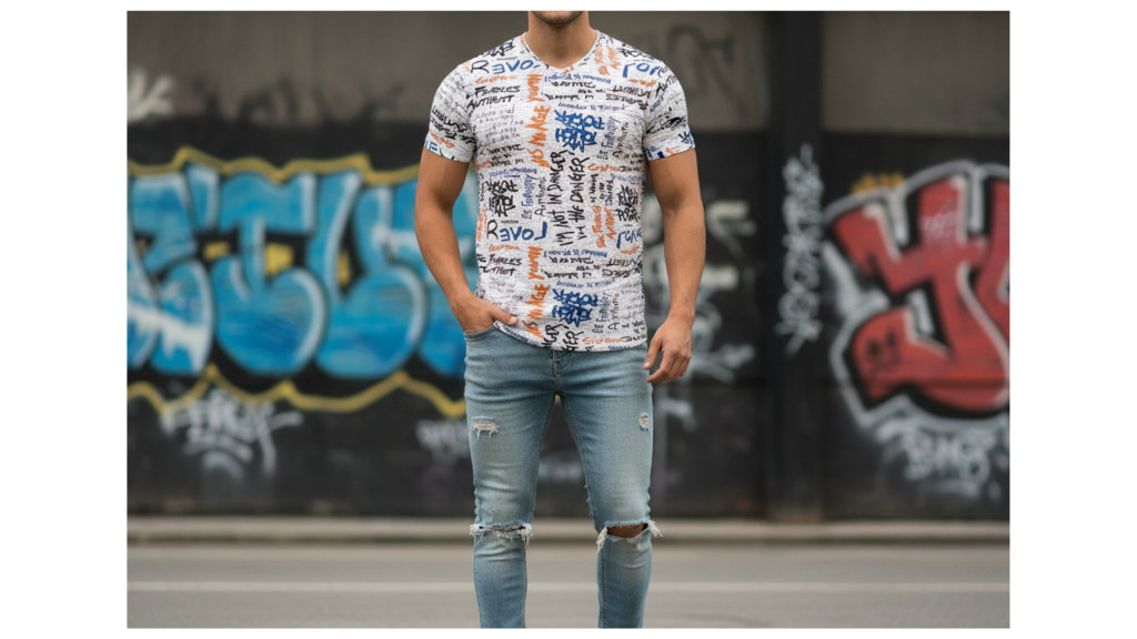 Legyen a stílusod olyan egyedi, mint egy utcai falfestmény: ez a vibráló, színes feliratokkal díszített póló a modern street-art világát idézi.