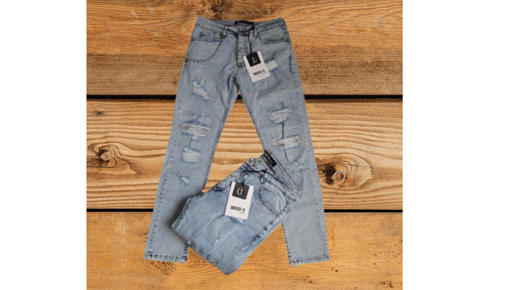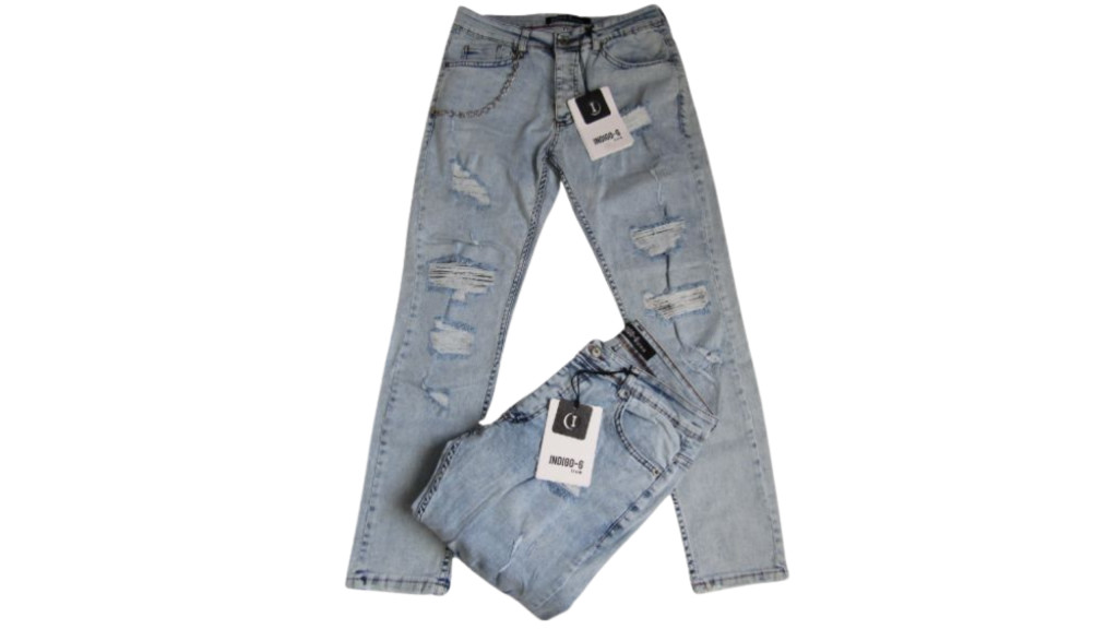 Szakadt, javított területek alatt, sötétebb szövetű világos kék farmer nadrág.